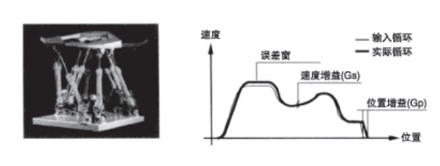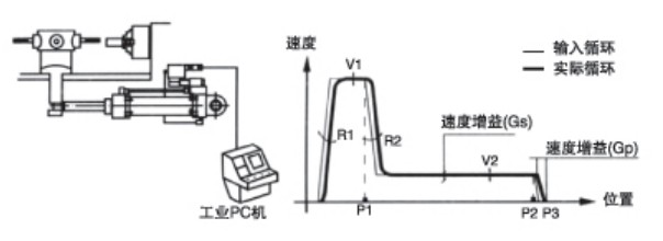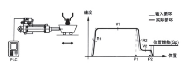 需設(shè)定的參數(shù):閉環(huán)位置增益Gp,位置P1、P2,快慢速度V1、V2,加速斜坡B1、B2,還可選擇第三速度V3(更慢)以達(dá)到最大精度(行程的0.1%)。
