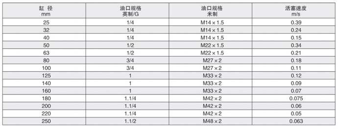 影響液壓缸速度的因素之一是引入或排出油口連接管路中的油液流量。連接管路中的油液流速應(yīng)限制與5m/s,以便把油液紊流、壓力損失和液壓沖擊減至最小。下表數(shù)據(jù)為油液流速5m/s時的活塞速度。如果超過此范圍請加大油口規(guī)格和連接管路。